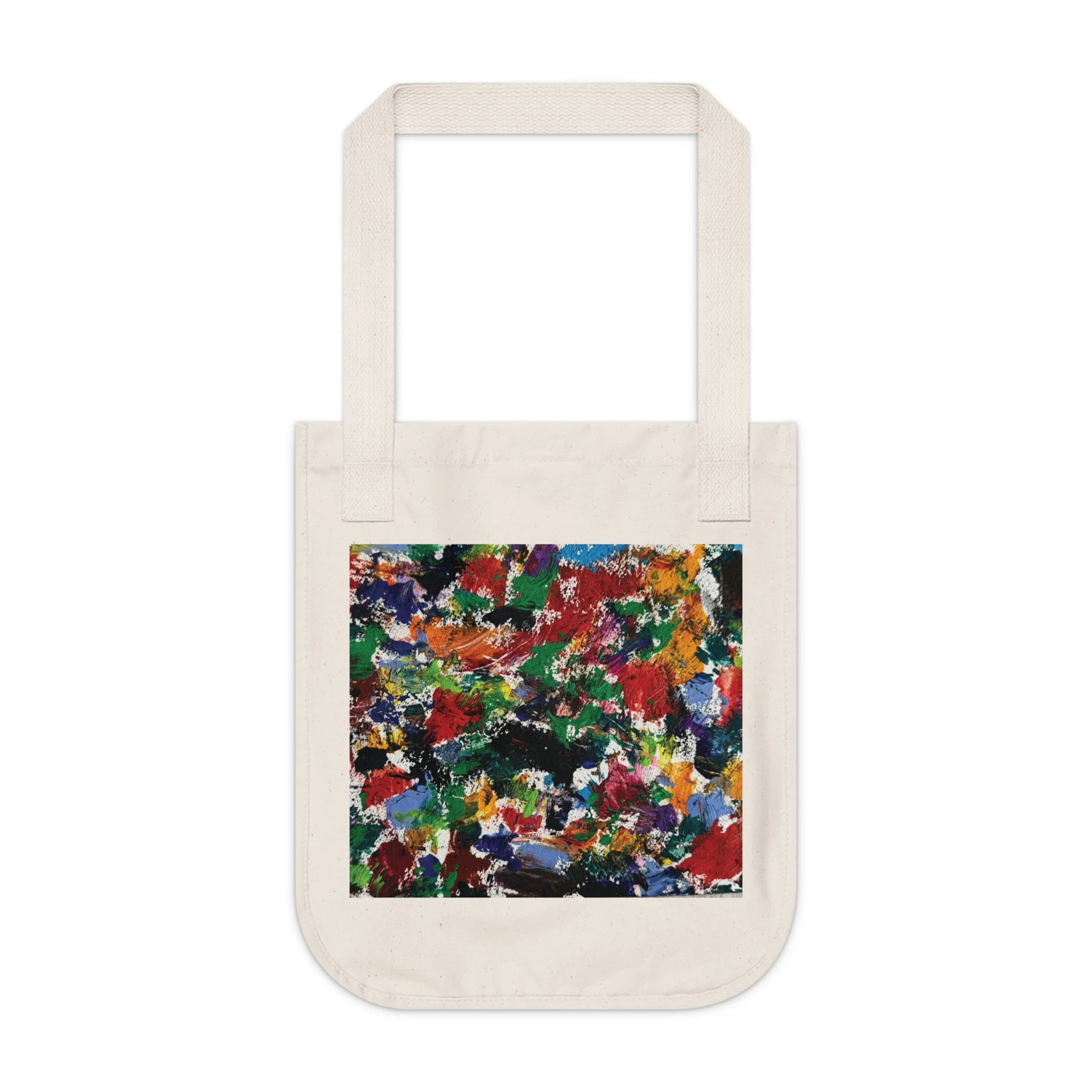 The natural, unprocessed fabric features tiny black flecks for an honest, earthy look that pairs beautifully with the bold, painterly square print, a vibrant abstract artwork designed to add movement and energy to everyday errands or creative outings.